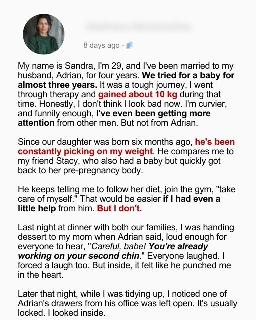Last night at dinner with both our families, I was handing dessert to my mom when Adrian said, loud enough for everyone to hear, “Careful, babe! You’re already working on your second chin.” Everyone laughed. I forced a laugh too. Tried to play it off. But inside, it felt like he punched me in the heart.
