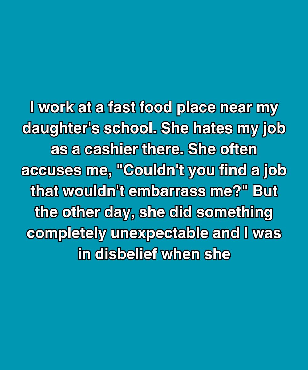 I work at a fast food place near my daughter’s school. She hates my job as a cashier there. She often accuses me, “Couldn’t you find a job that wouldn’t embarrass me?” But the other day, she did something completely unexpectable and I was in disbelief when she stepped behind the counter—right in front of a full lunch crowd—and grabbed my hand.