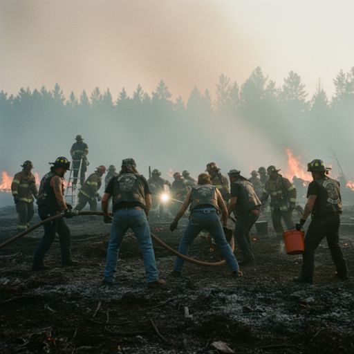For hours they worked. The bikers and the firefighters, sweating, shouting, pushing the fire back foot by foot. People from town brought water bottles, sandwiches, whatever they had. It turned into this strange kind of community battle, everyone giving whatever they could.