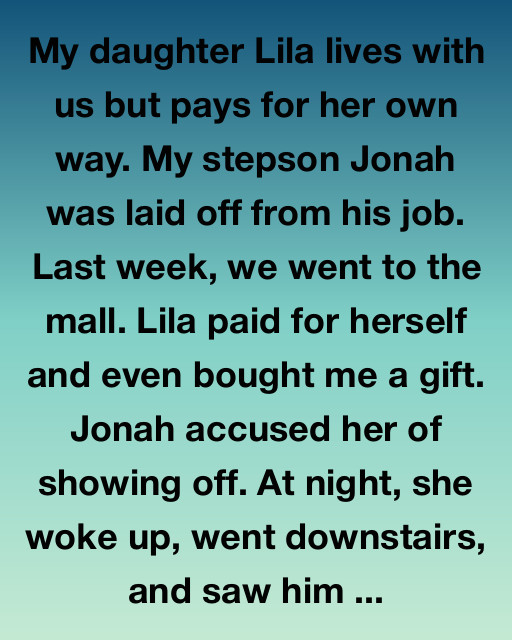 My daughter Lila lives with us but pays for her own way. My stepson Jonah was laid off from his job. Last week, we went to the mall. Lila paid for herself and even bought me a gift. Jonah accused her of showing off. At night, she woke up, went downstairs, and saw him rifling through her purse.