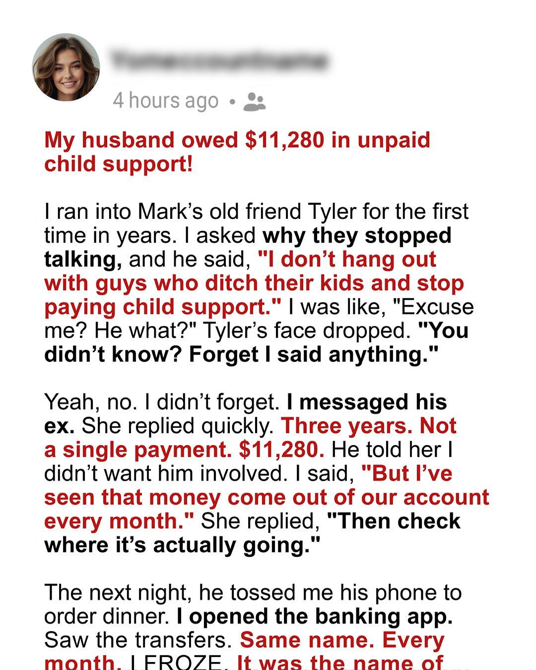 My name is Camila, and I thought I knew my husband, Mark. For years, he warned me to stay away from his ex-wife, Sarah, claiming she was bitter and out to ruin our marriage. I believed him and built my life around that wall. Then one afternoon, I ran into his former best friend, Tyler, who accidentally revealed that Mark hadn’t paid child support in years. Shocked, I reached out to Sarah. She showed me court documents proving he owed $11,280. He had been taking that money from our account each month, pretending to send it to her.