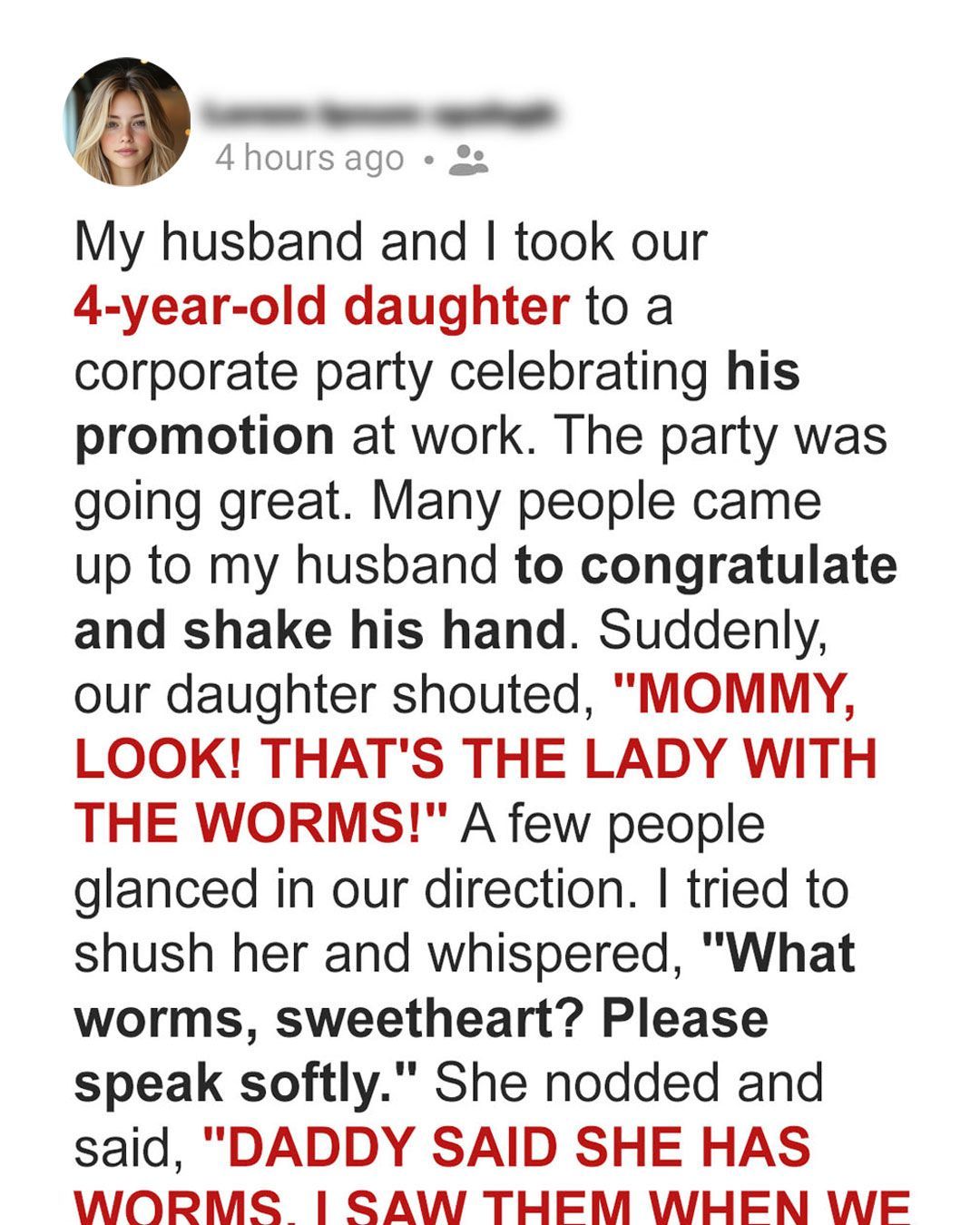While chatting with a colleague’s wife, Sophie tugged on my sleeve and pointed to a woman at the bar. “Mommy, look! That’s the lady with the worms,” she said, loud enough for others to hear. Confused, I gently questioned her, and she explained that she had seen “red worms” on that woman’s bed—Tina, a coworker I’d noticed around Mark before. Later, when I confronted Mark privately, his excuses were shaky. He claimed Sophie had seen hair curlers during a quick visit to pick up paperwork. But his nervous laughter and evasive answers told me everything I needed to know: he was lying.