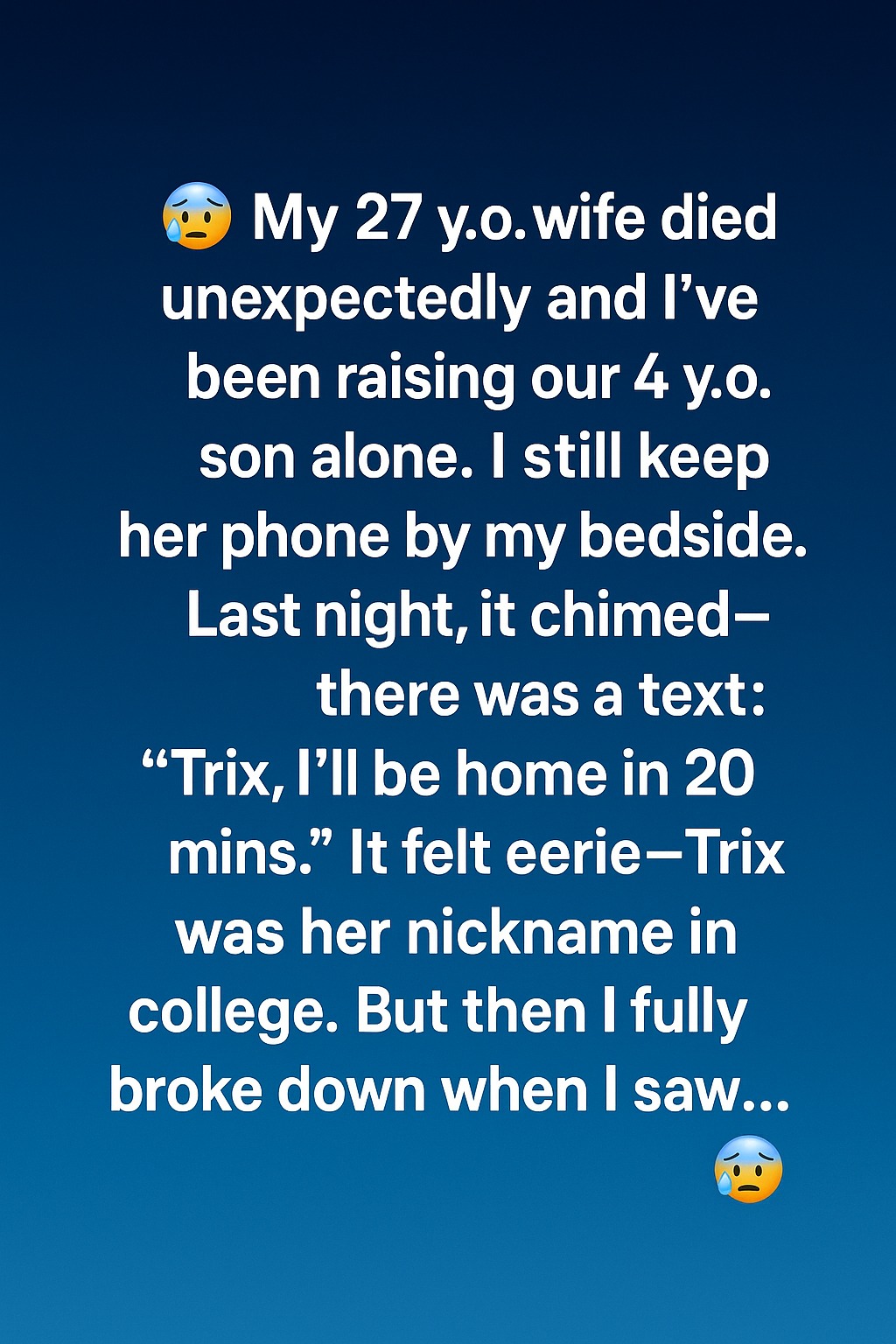 I kept her phone on the nightstand, like a small piece of her I couldn’t let go of. It hadn’t lit up in months, until last night, when a soft chime broke the silence. The message read, “Trix, I’ll be home in 20 mins.” My breath caught. “Trix” was her nickname for me in college — something no one else ever used. My hands trembled as I opened the message thread, hoping for reason, fearing my own hope.