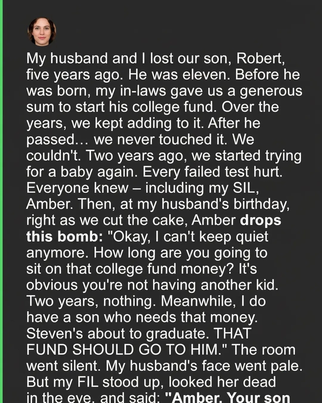 At a recent family gathering for my husband’s birthday, his sister, Amber, brought up the fund. Her words were direct — she suggested we give the money to her teenage son instead. The room fell silent. Before I could respond, my father-in-law spoke firmly, reminding her that both grandsons had been given equal funds and that her own had long been spent. His calm but steady words carried the weight of fairness and truth, leaving no room for argument.