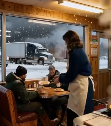The first night felt like a little miracle in the middle of the storm. Those truckers — rough hands, road-tired eyes — suddenly looked like boys again warming up after a long winter walk. They shared stories about families waiting back home, joked about their coffee habits, and passed around photos of pets and grandbabies. I kept cooking until the grill steamed the windows, my tiny diner glowing like a pocket of summer in a frozen world. Outside, snow swallowed the sky, but inside, it felt safe, human, warm.