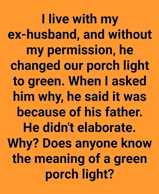 I live with my ex-husband, and without my permission, he changed our porch light to green. When I asked him why, he said it was because of his father who passed away recently. He didn’t elaborate. Why? What does a green porch light mean?