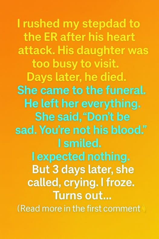I drove my stepdad to the ER on a cold, heavy morning after he suffered a heart attack. He tried to insist he was “fine,” but I could see the fear beneath his jokes and sweat. I stayed by his side through every test, holding his hand as he drifted in and out. His daughter couldn’t get there in time, but I never held that against her. Life creates distance without meaning to.