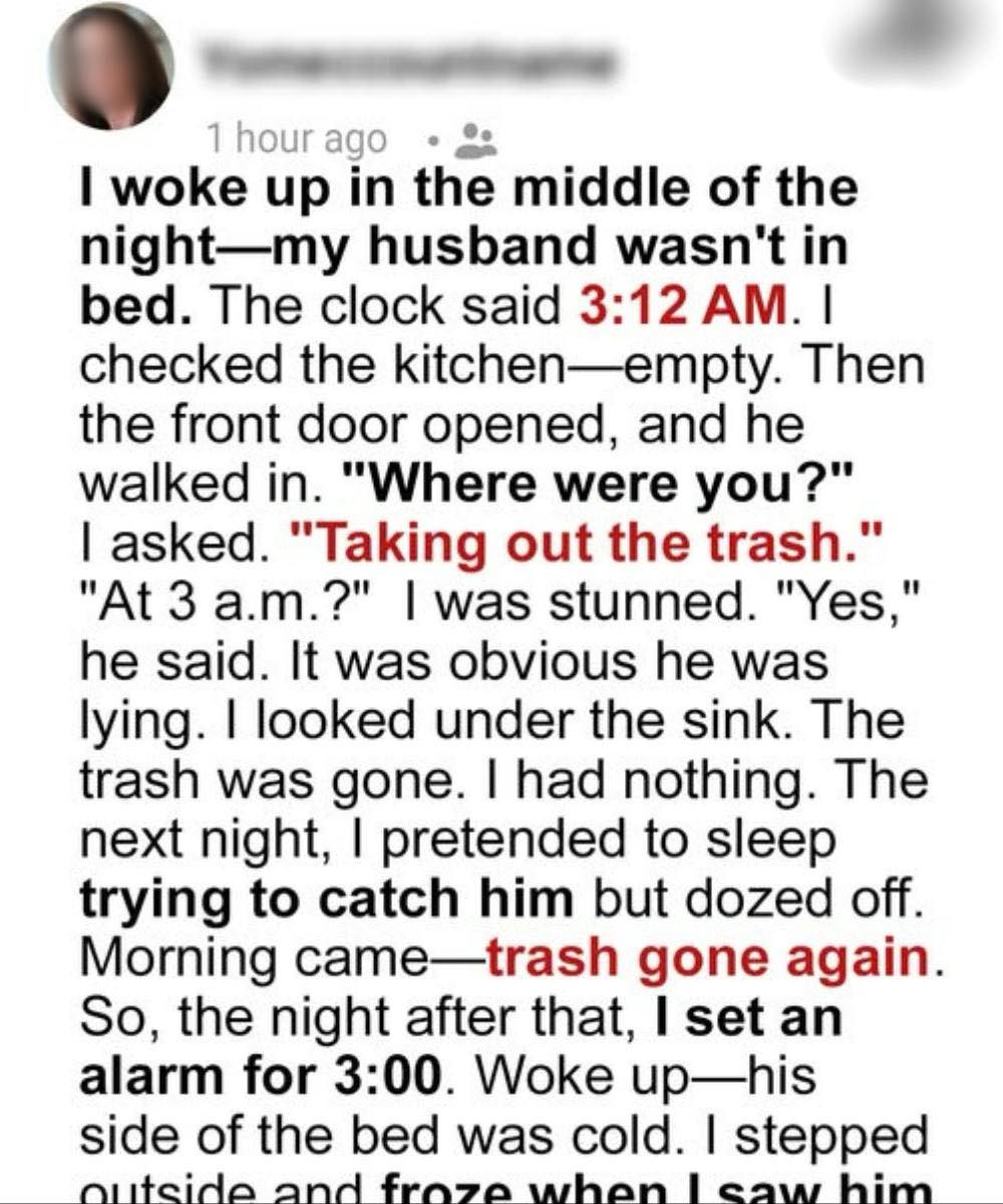 For over two decades, Dave and I shared a life filled with routines and quiet comforts. Married for 22 years, our days were predictable, our nights peaceful. That’s why, when Dave began taking out the trash at 3 AM, a time he usually spent snoring beside me, I sensed something was amiss.