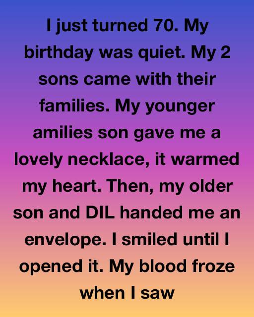 We laughed, we ate, and the afternoon was filled with the usual chaos and joy of a family gathering. I felt truly loved and appreciated. Then, the gift presentation shifted to my older son and his wife. Andrew and Sofia approached me, their expressions overly serious, their gift contained in a stiff, formal envelope.
