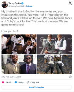 Additionally, Torrey Smith honored Jacoby on X with a number of old photos. Invoking the deceased athlete as his “brother,” he expressed gratitude to God for their shared experiences and the influence Jacoby had on society.