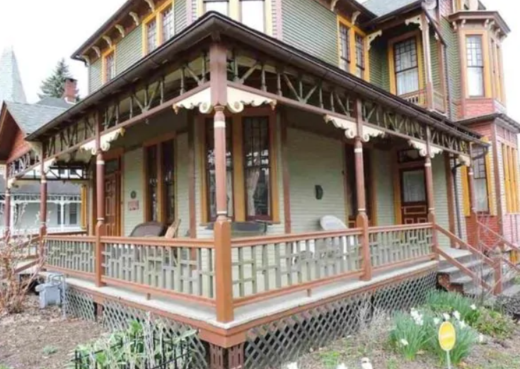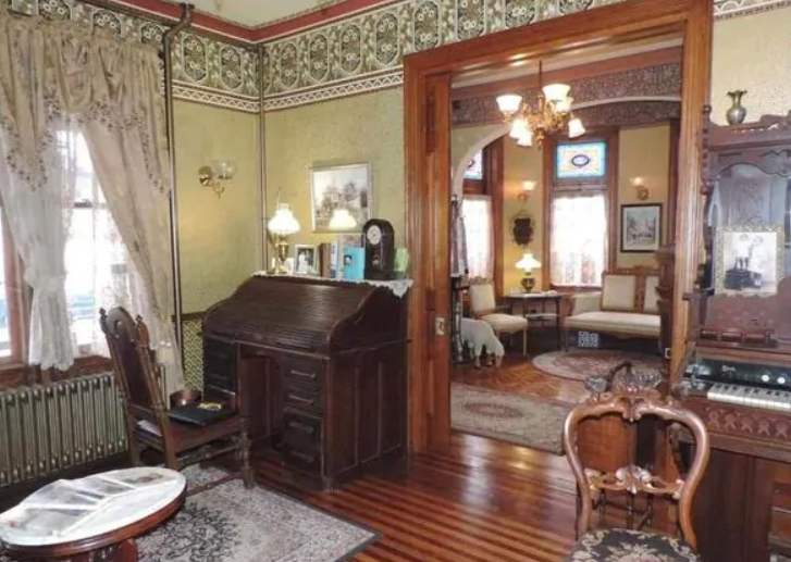 Architecturally, the mansion blends elements of Imperial Revival and Queen Anne design. A prominent turret once provided sweeping views of the surrounding land, while decorative brick patterns and tall windows suggest the elegance the home originally displayed. With five bedrooms and expansive common areas, the residence was clearly designed for both family living and formal gatherings. Even after decades of neglect, its presence remains striking.