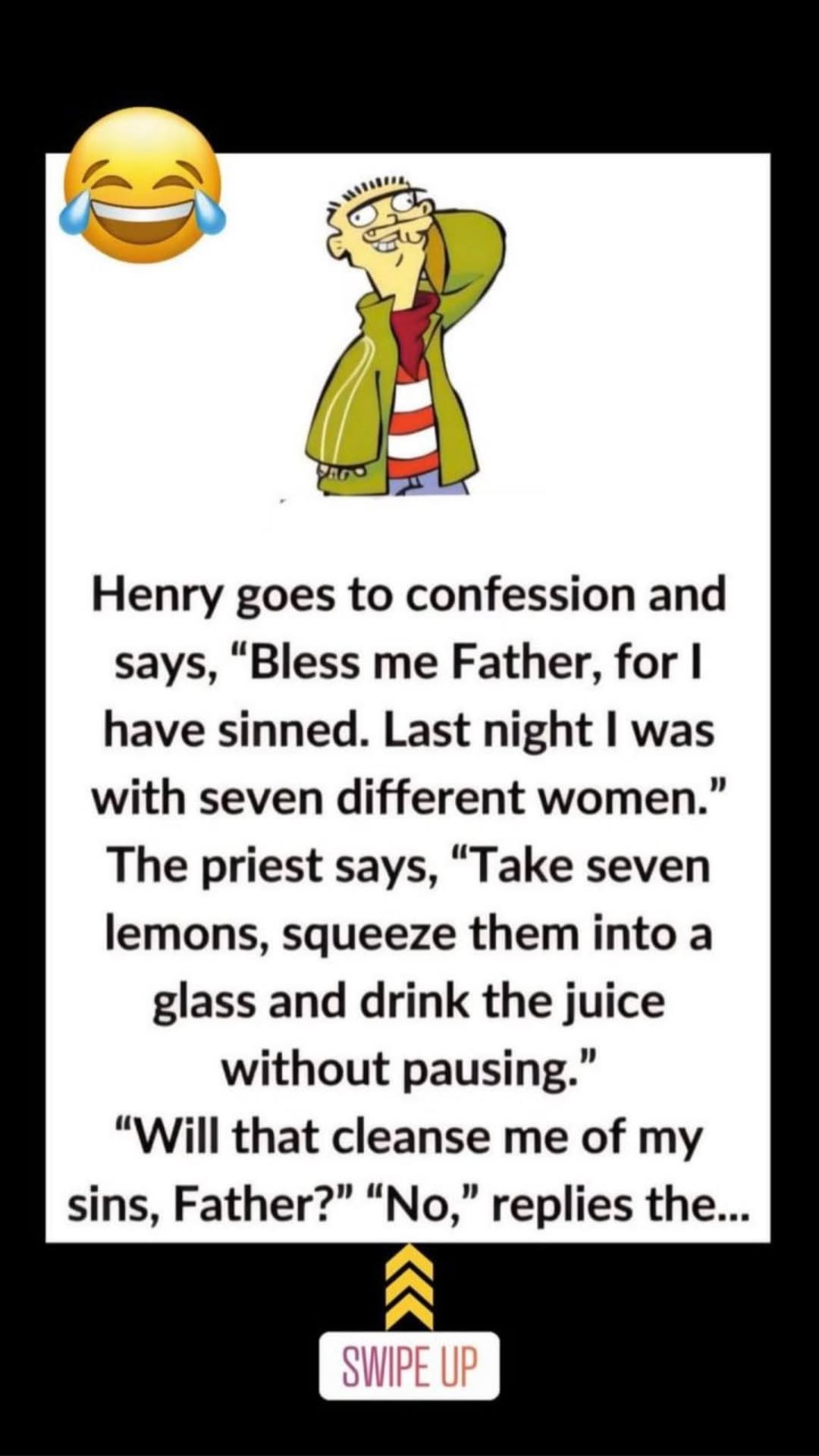Henry goes to confession and says, “Bless me Father, for I have sinned. Last night I was with seven different women.”