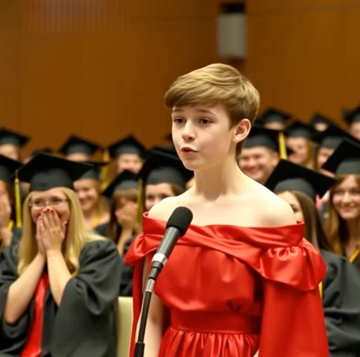 I know why you’re laughing,” he said, his voice soft but steady, echoing through the auditorium. “You see a boy in a dress and you find it funny or strange, but tonight, I want to talk about being true to oneself.”