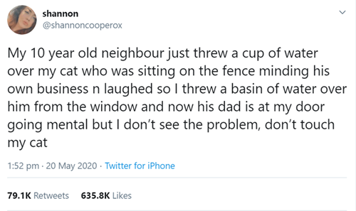 “My 10-year-old neighbour just threw a cup of water over my cat who was sitting on the fence minding his own business and laughed so I threw a basin of water over him from the window and now his dad is at my door going mental but I don’t see the problem, don’t touch my cat.”